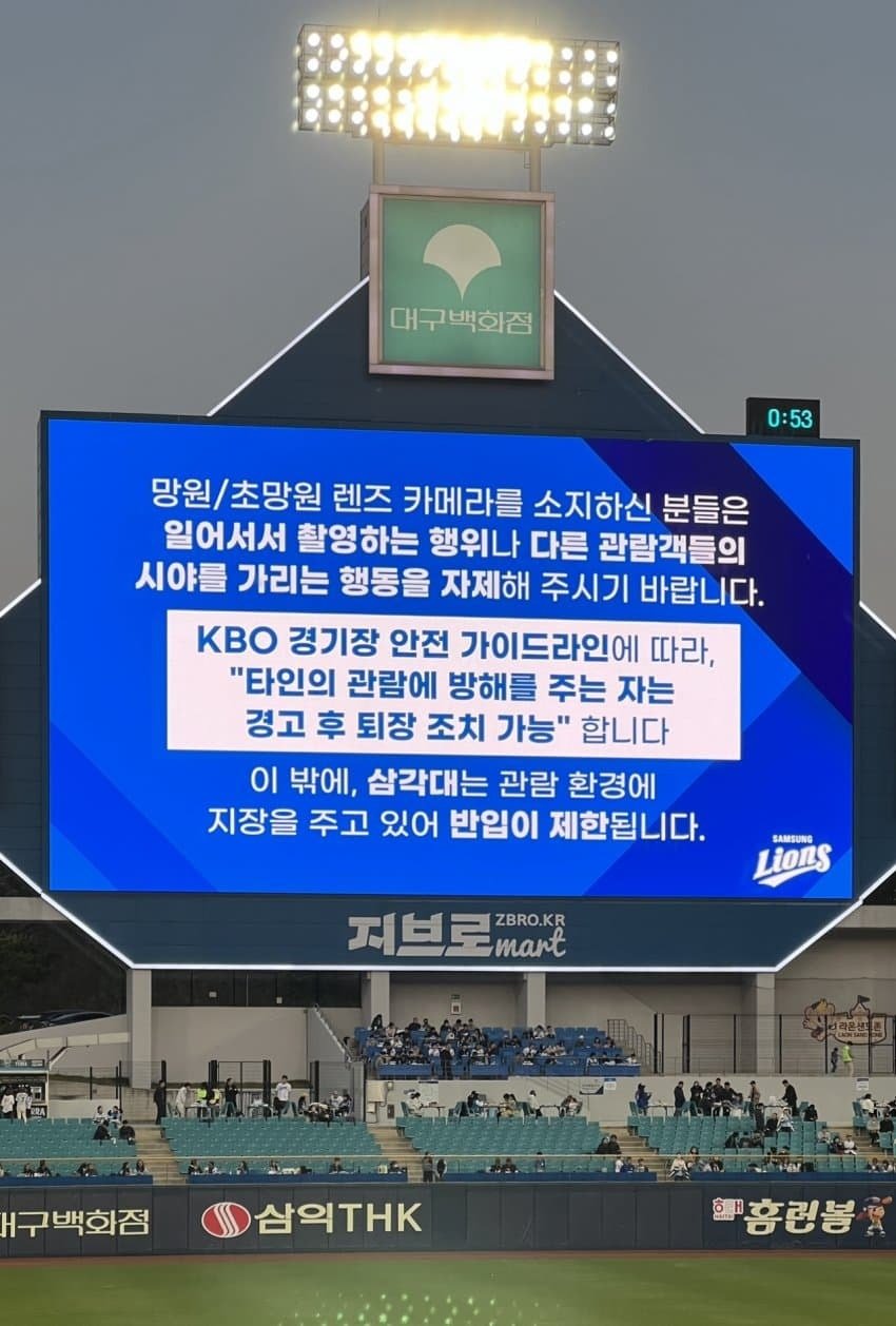 삼성 측은 일부 팬들이 야구 관람 시 대포 카메라와 삼각대로 사용함으로 인해 다른 관객들이 피해를 입는다는 컴플레인이 접수되었습니다.