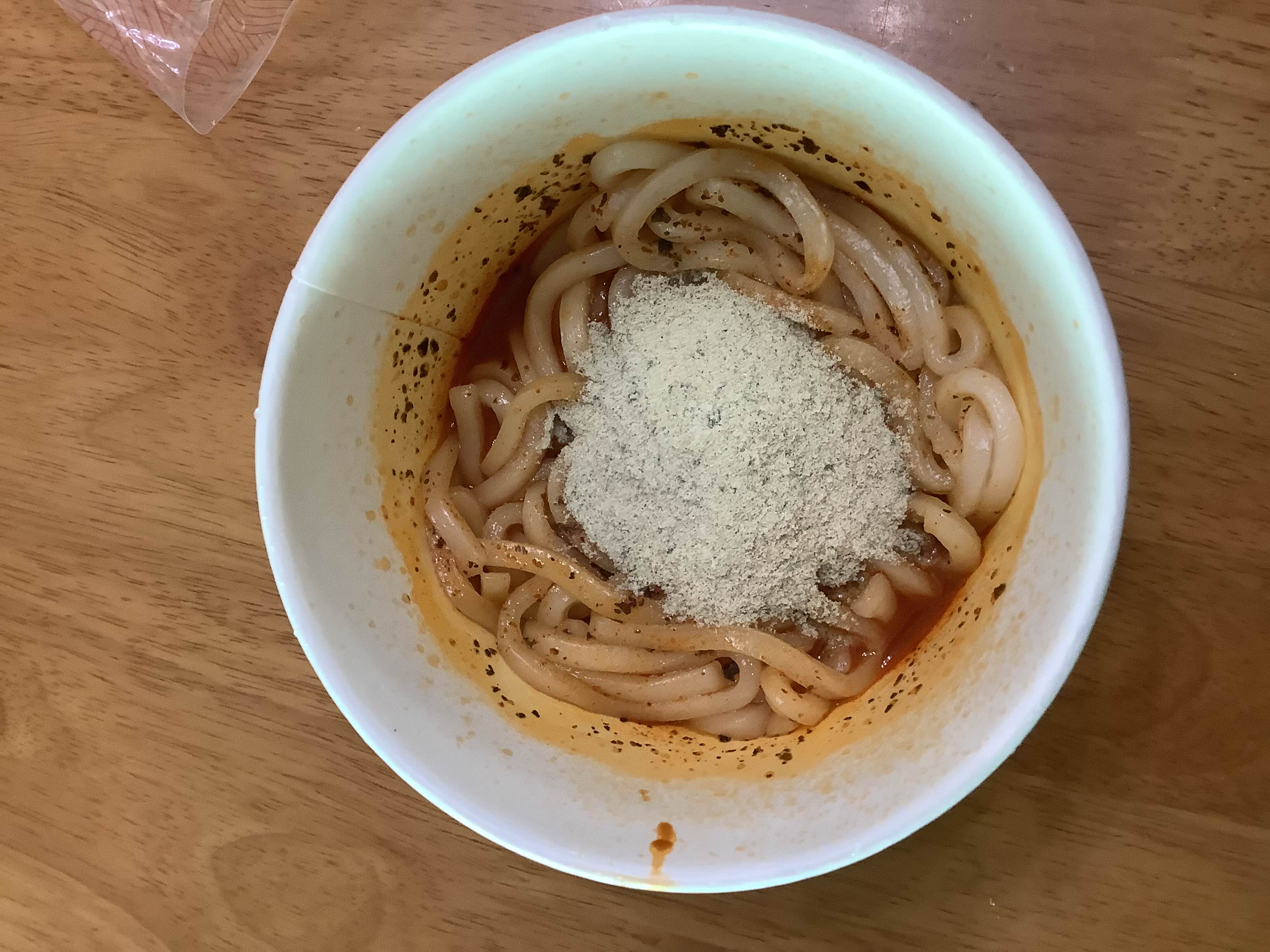 1. 용기에 면과 바질크림불닭우동 소스를 개봉하여 넣습니다.