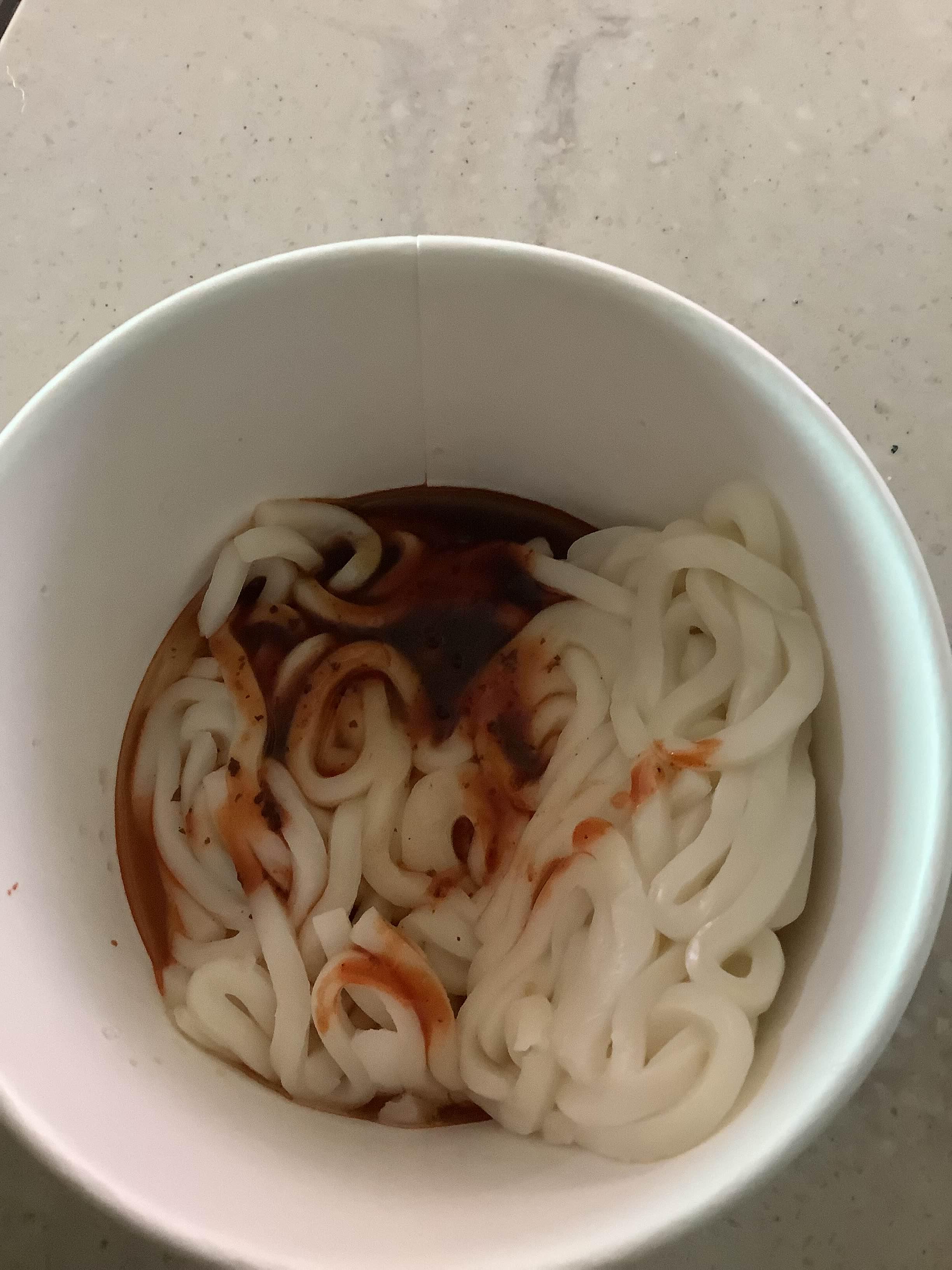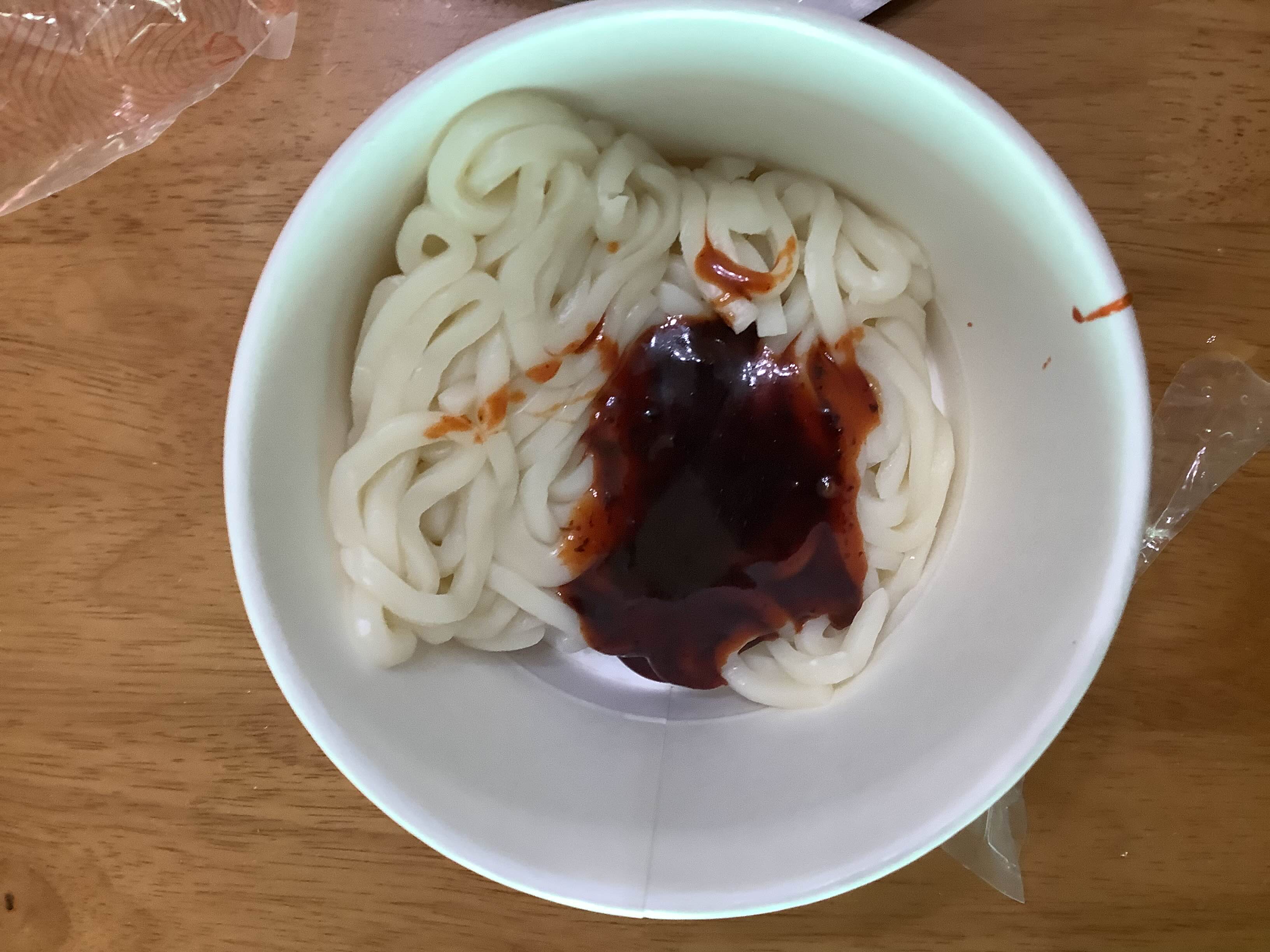 1. 용기에 면과 바질크림불닭우동 소스를 개봉하여 넣습니다.