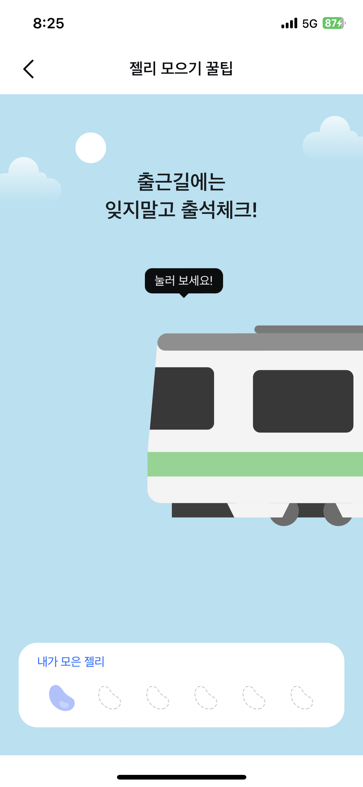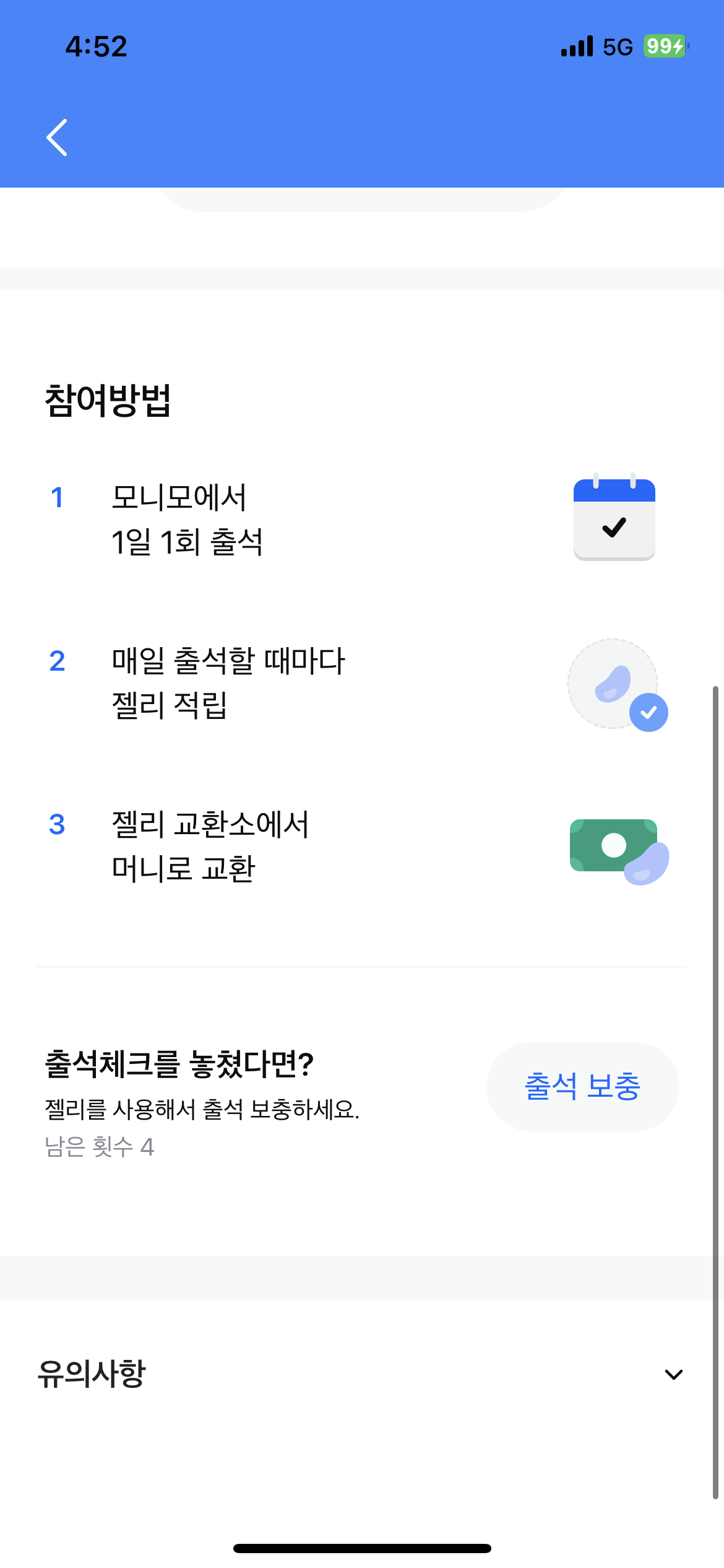 만약 출석 체크를 놓쳤다면 가지고 있는 젤리를 사용해 출석 체크를 보충할 수 있습니다.