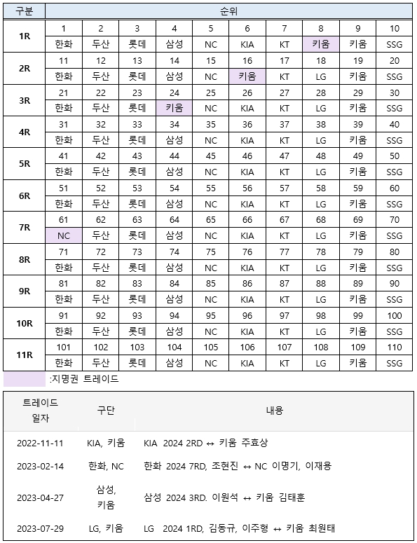트레이드를 이용해 구단이 다음 연도 지명권과 선수를 교환할 수 있도록 허용한 규약에 따라서 트레이드를 통해 지명권을 양수 받은 키움 히어로즈는 LG 트윈스와 삼성 라이온즈가 가지고 있던 1,2,3라운드 지명권을, NC 다이노스는 한화 이글스에게 양수받은 7라운드 지명권을 행사하게 됩니다.