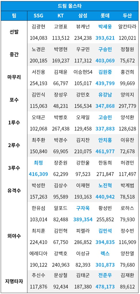 드림 올스타 팀에선 이번 시즌 벌써 11번의 매진 경기를 기록하며 뜨거운 열기를 자랑하고 있는 롯데 자이언츠의 '기세'가 돋보입니다. 현재 롯데 자이언츠는 드림 올스타 3루수 부문(SSG의 최정선수)과 외야수 부문 한자리(삼성 라이온즈의 구장욱선수)를 제외한 10개의 부문에서 1위를 차지중에 있습니다.