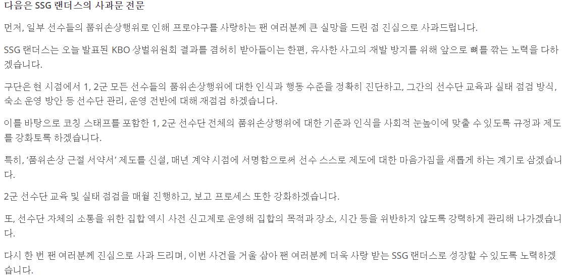 다음은 SSG 랜더스의 사과문 전문입니다.