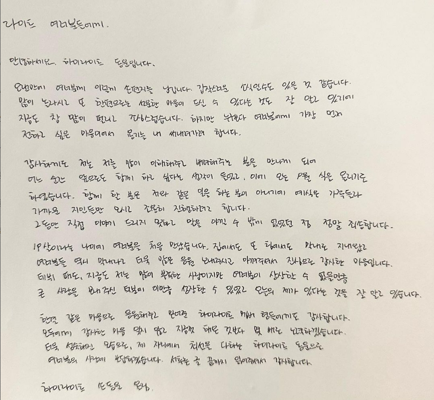 이어 손동운은 "모두에게 감사한 마음을 잊지 않고 지금까지 해왔던 것보다 몇배로 노력하겠다"며 "더욱 성숙해진 모습으로, 최선을 다하는 하이라이트의 동운으로 여러분의 사랑에 보답하겠다."라고 적었습니다.