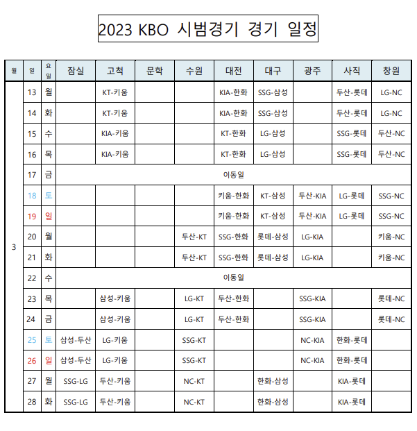 시범 경기 일정에 대해 먼저 알아볼 텐데요. 2023년 3월 13일 월요일부터 시작하는 시범경기는 총 16일간 열리게 되며 시범경기의 마지막날은 2023년 3월 28일 화요일입니다.