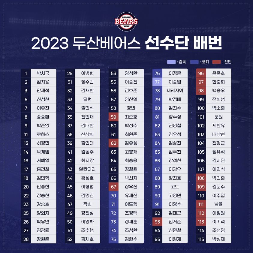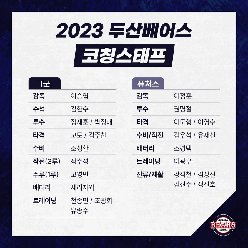 두산은 이승엽 감독외에도 1군 투수코치인 정재훈, 배영수, 퓨처스 투수코치인 권명철, 퓨처스 배터리 코치인 조경택, 퓨쳐스 트레이닝 코치인 이광우, 퓨쳐스 재활/잔류군 코치인 김상진을 제외한 모든 포지션의 변화가 있습니다. 정말 대대적인 변화네요.