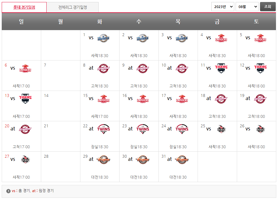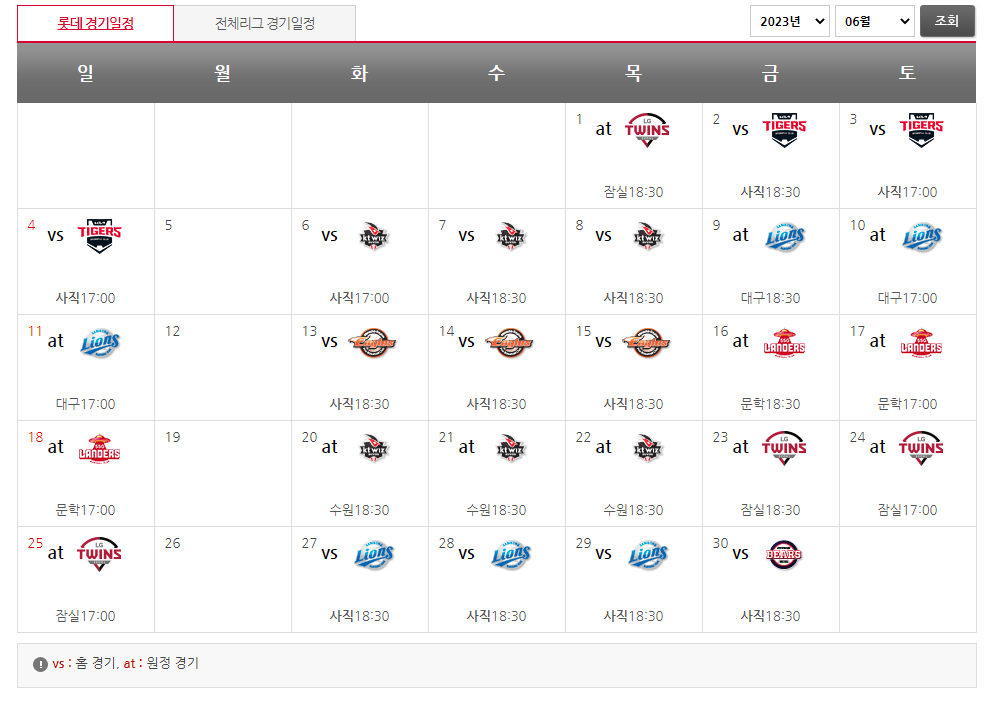 vs라고 써있는 날이 롯데가 홈에서 경기하는 날입니다.