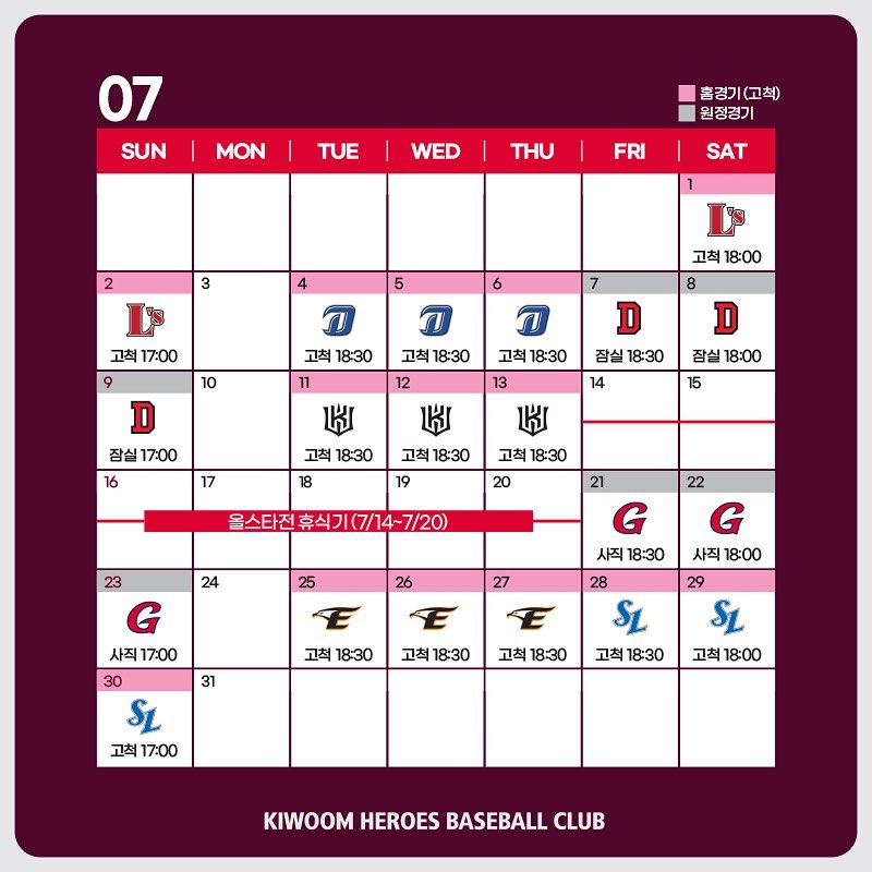 7월 15일엔 2023 KBO 올스타전이 개최될 예정으로 7월 14일 금요일부터 7월 20일 목요일까지 올스타 브레이크 기간을 갖습니다.