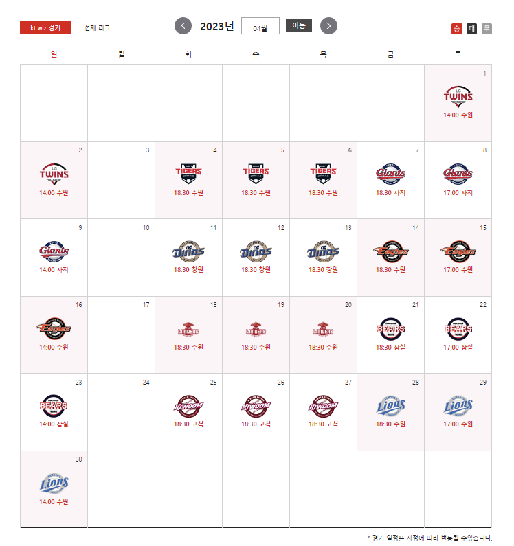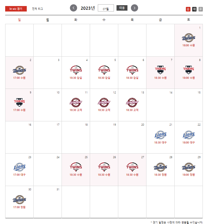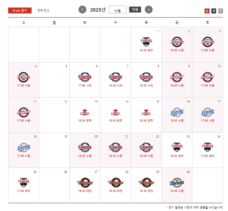 붉은 바탕이 홈경기가 치러지는 날입니다.