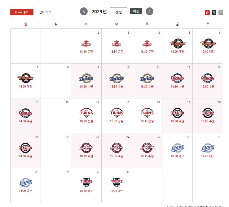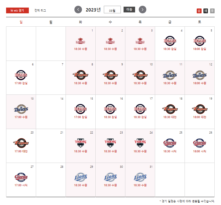 붉은 바탕이 홈경기가 치러지는 날입니다.