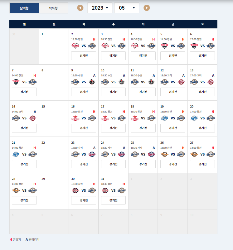 H라고 표시되어 있는 날이 홈에서 경기를 치르는 날입니다.