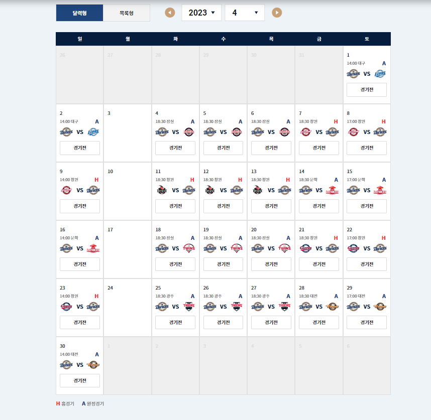 H라고 표시되어 있는 날이 홈에서 경기를 치르는 날입니다.