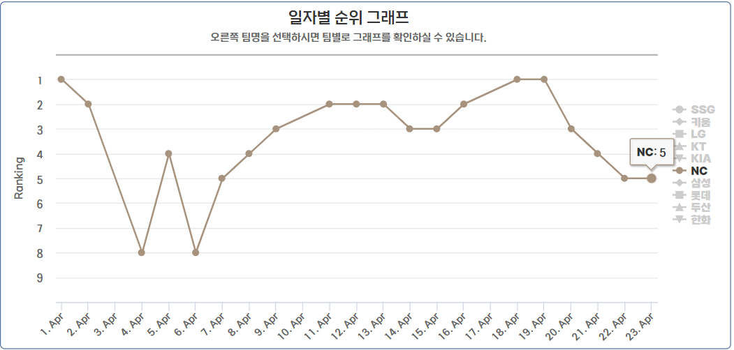 8위까지 내려 앉았다가 무서운 상승세를 보여주며 1위를 찍었지만 최근 계속된 연패로 5위에 랭크된 NC 다이노스