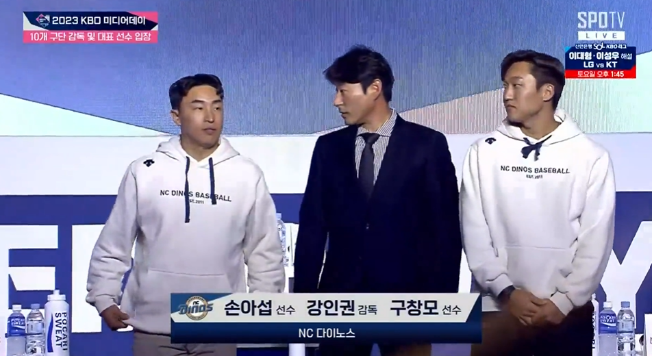 - NC의 강인권 감독: 지난 몇 시즌동안 NC 다이노스가 롤러코스터의 행보를 보였던 것 같다. 20년엔 영광도 있었고 어려움이 있었던 시즌이었는데, 2023 시즌에는 스탶과 선수들 한마음 잘 모아서 즐거운 야구 또 승리하는 야구를 팬 여러분들께 선사할 수 있도록 최선의 노력을 다 하겠다. 많은 응원 부탁 드겠습니다.