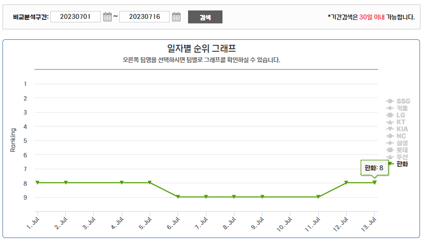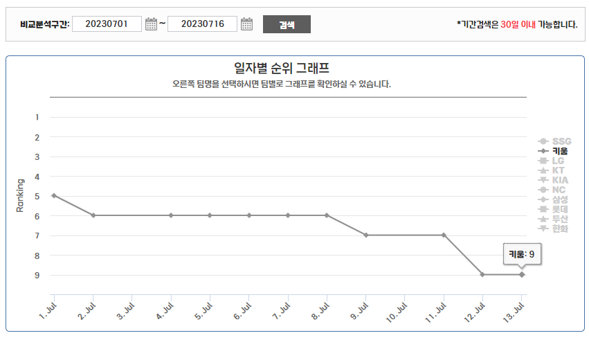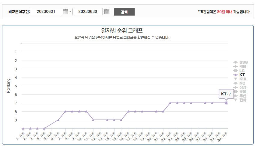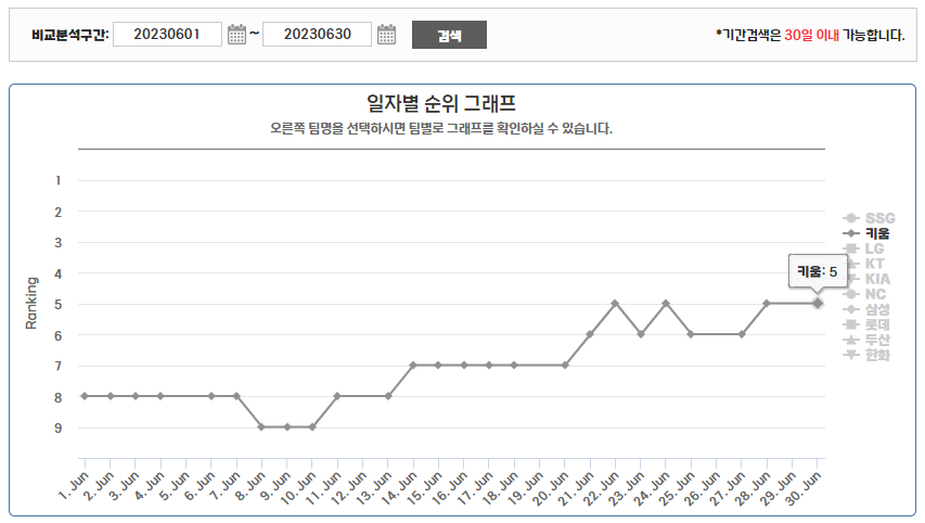 2023 KBO 10개 구단 6월 및 7월 순위 변동 비교