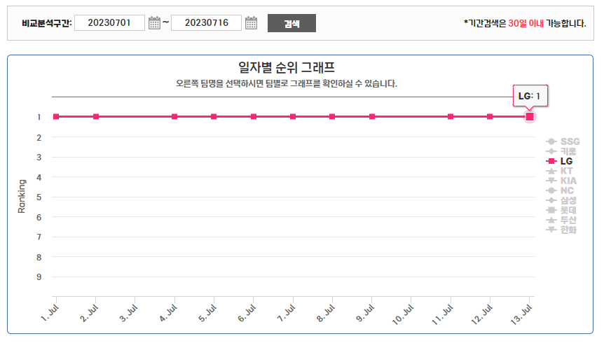 6월 1위와 2위를 오가다가 6월 후반부부터는 꾸준히 1위를 유지하고 있는 LG 트윈스