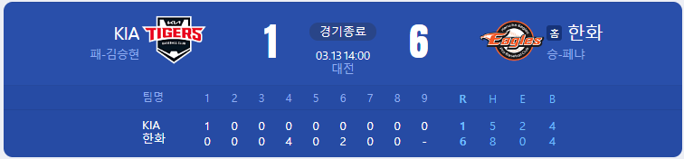 한화이글스가 기아타이거즈를 상대로 6 대 1 승리를 가져갑니다.