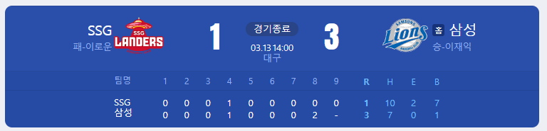 1대 1로 팽팽하게 진행되던 경기는 8회 말 김태훈의 적시타로 삼성에게 승리가 기울었으며 9회 초 SSG가 투아웃 만루의 기회를 얻었지만 최충현 투수가 김정민 타자를 삼진으로 잡아내며 경기는 그대로 끝나게 됩니다.