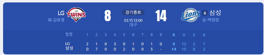| 230314 화요일 KBO 시범경기 리뷰 및 순위 (0) | 2023.03.15 |