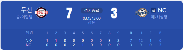 두산베어스가 엔씨다이노스를 상대로 7 대 3 승리를 가져갑니다.