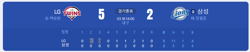 하지만 그 후 엘지는 7회에 2점과 8회에 1점을 더 추가한 반면, 삼성은 더 이상 점수를 추가하지 못해 경기는 5 대 2 그대로 끝이 납니다.