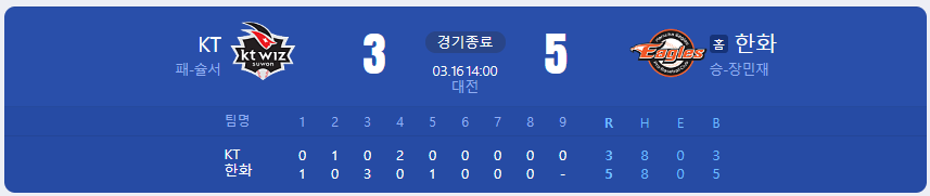 한화 이글스가 kt 위즈를 상대로 5 대 3 승리를 가져갑니다.