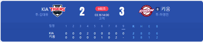 키움히어로즈가 기아타이거즈를 상대로 3 대 2 승리를 가져갑니다.