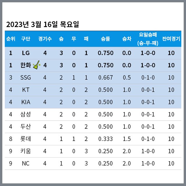 오늘도 역시 프로야구 시범경기 리뷰와 순위 확인을 해볼게요!