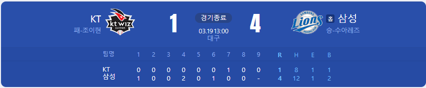 무득점으로 6회까지 마무리했던 kt는 7회 초 삼성 김대우를 상대로 김준태가 솔로 홈런을 때리며 영봉 패는 면하게 됐지만, kt는 시범경기 4연패의 늪에 빠지게 됩니다.