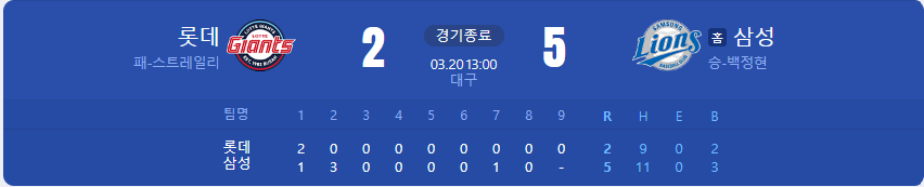 시범경기 첫 등판했던 롯데의 스트레일리가 2이닝 동안 6개의 안타와 2개의 사사구를 허용하며 4 실점 예상외로 굉장히 고전하는 모습을 보였습니다. 반면 삼성의 선발로 나선 백정현투수는 2 실점을 한 2회를 제외하면 4이닝 동안 단 3개 만의 안타를 허용하며 안정감 있는 투구를 보여줬습니다.