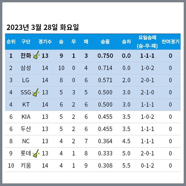 230328 화요일 KBO 시범경기 리뷰 및 순위