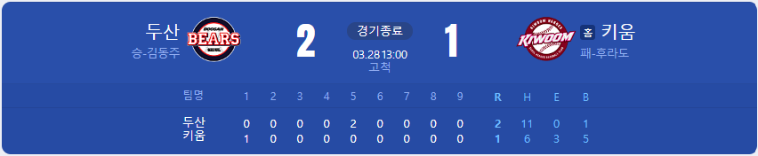 두산 베어스가 키움 히어로즈를 상대로 2 대 1 승리를 가져갑니다.