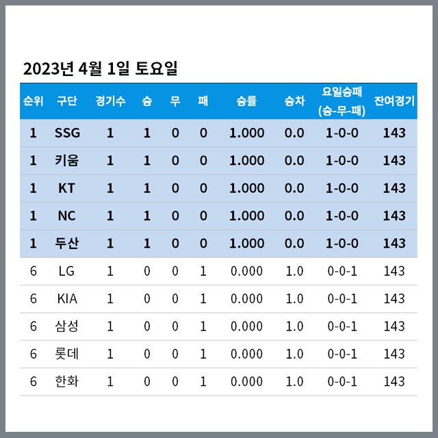| 230404 화요일 KBO 정규시즌 리뷰 및 순위 확인 (0) | 2023.04.05 |