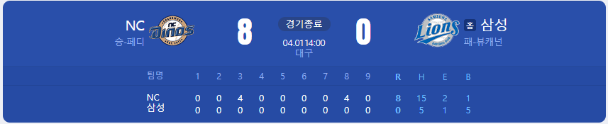 NC 다이노스가 삼성 라이온즈를 상대로 8 대 0 승리를 가져갑니다.