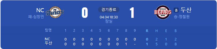 두산 베어스가 NC 다이노스를 상대로 1 대 0 승리를 가져갑니다.