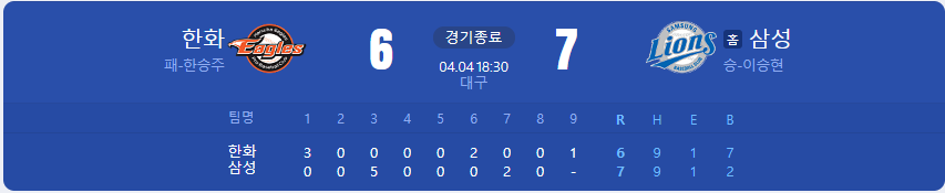 삼성 라이온즈가 한화 이글스를 상대로 7 대 6 승리를 가져갑니다.