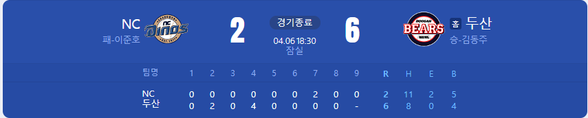 4회 말에는 양의지선수와 강승호선수의 안타 이후 양석환선수의 적시타가 터졌고 NC 실책을 틈타 1점을 더 추가하는 데 성공합니다. 이후 이닝은 끝나지 않고 정수빈선수가 2타점 적시타를 날리며 두산은 6 대 0까지 점수차를 벌렸습니다.