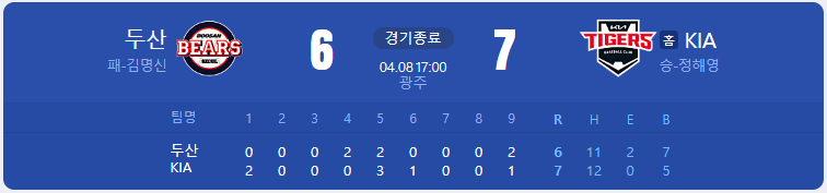 기아 타이거즈가 두산 베어스를 상대로 7 대 6 끝내기 승리를 가져갑니다.