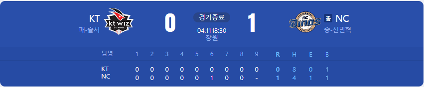 NC 다이노스가 KT 위즈를 상대로 1 대 0 승리를 가져갑니다.