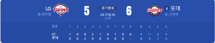 롯데 자이언츠가 LG 트윈스를 상대로 6 대 5 승리를 가져갑니다.