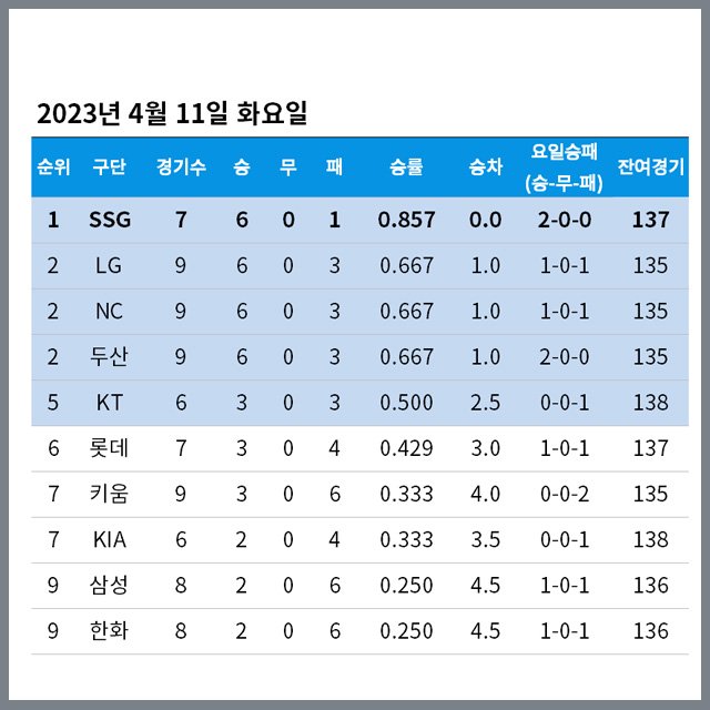 2023년 4월 11일 화요일 정규시즌 순위