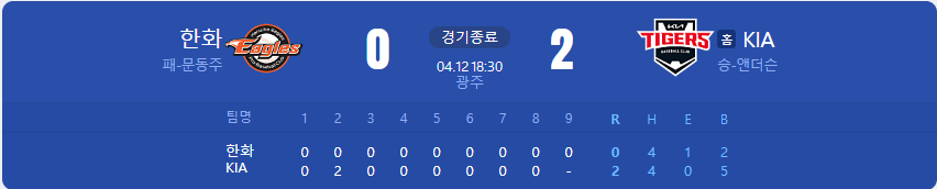 이후 기아는 추가 득점을 하지 못했지만, 한화 이글스가 KIA의 투수진에 꽁꽁 묶이는 바람에 경기는 그대로 2 대 0 마무리가 되었습니다.