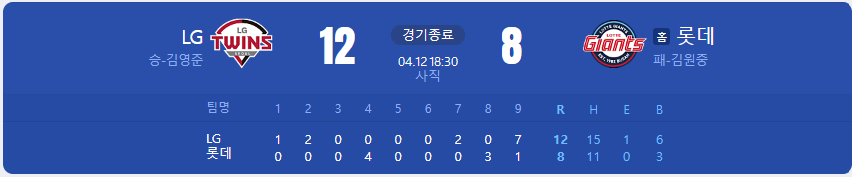 엘지 트윈스가 롯데 자이언츠를 상대로 12 대 8 짜릿한 역전승을 가져갑니다.