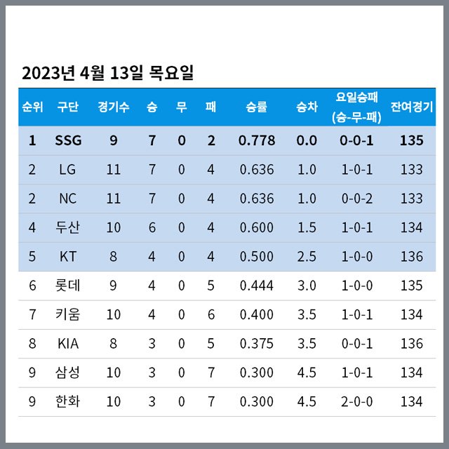 | 230414 금요일 KBO 정규시즌 리뷰 및 순위 확인 (0) | 2023.04.15 |