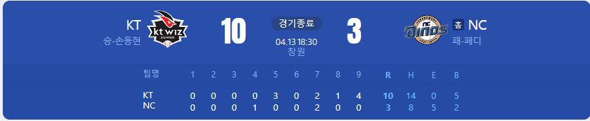 KT위즈가 NC 다이노스를 상대로 10 대 3 승리를 가져갑니다.
