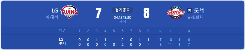 롯데 자이언츠가 LG 트윈스를 상대로 8 대 7 승리를 가져갑니다.