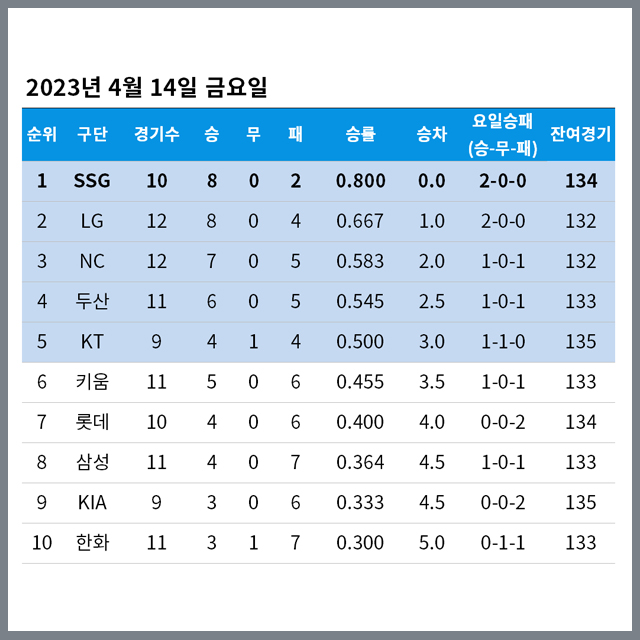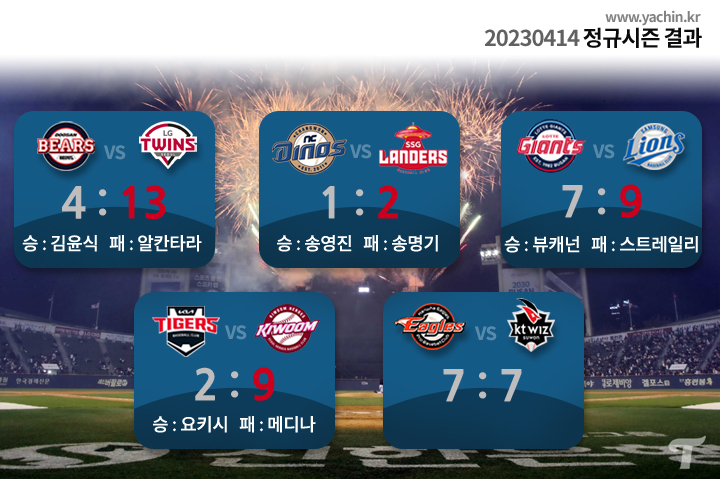 | 230415 토요일 KBO 정규시즌 리뷰 및 순위 확인 (0) | 2023.04.16 |