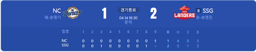 SSG가 NC 다이노스를 상대로 2 대 1 승리를 가져갑니다.