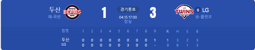 플럿코선수와 대결을 펼친 두산의 곽빈선수는 7과 1/3 동안 6개의 피안타 2개의 볼넷 3 실점으로 호투했지만 야수진의 도움을 받지 못한 채 패전의 쓴맛을 맛봐야 했습니다.