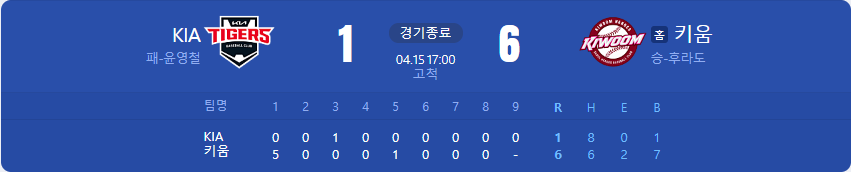 키움 히어로즈가 KIA 타이거즈를 상대로 6 대 1 승리를 가져갑니다.